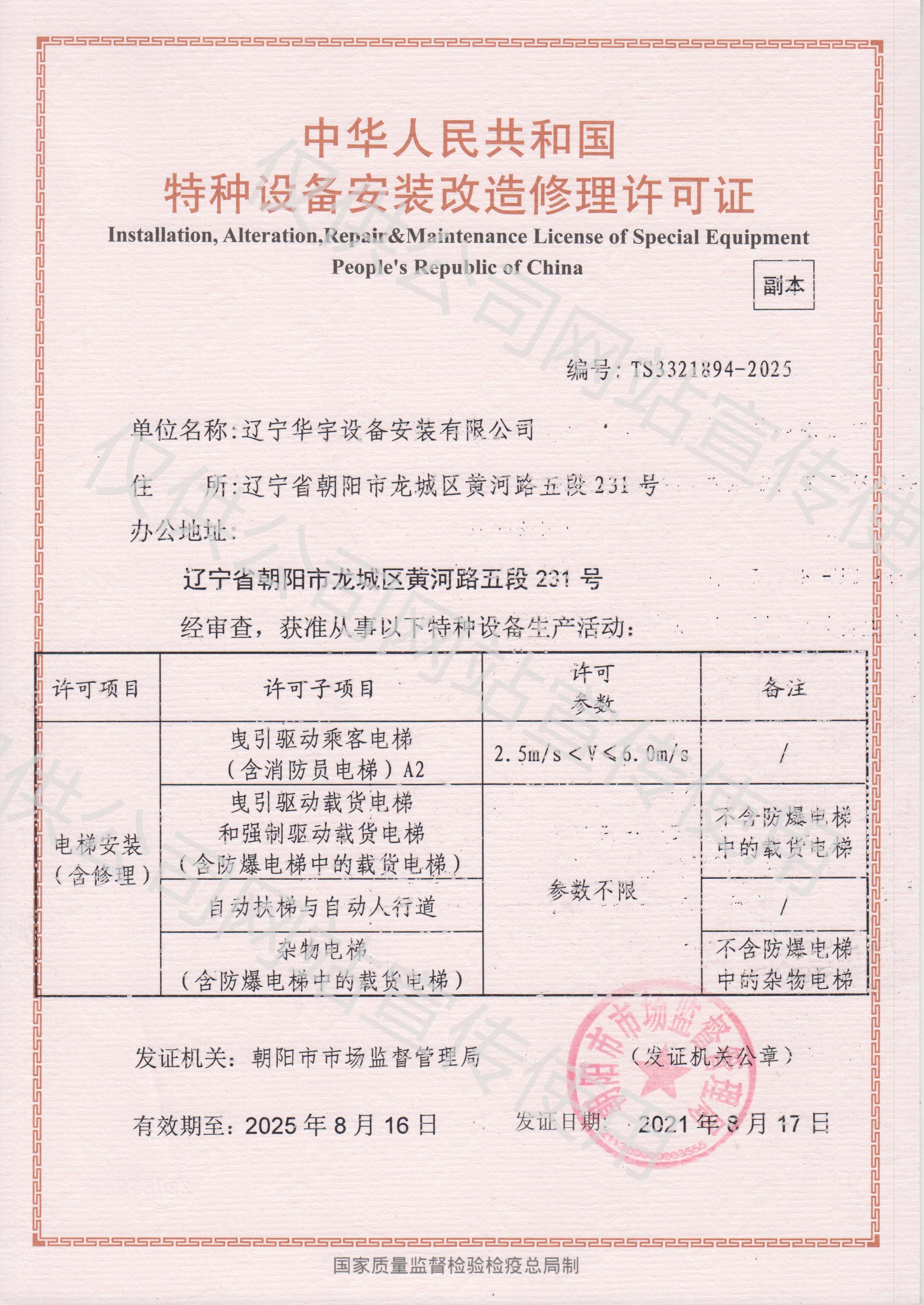 ? ? ? ?? 遼寧華宇設(shè)備安裝有限公司成立于2002年7月15日,注冊(cè)資金10000萬。公司占地面積60余畝,建筑面積4000余平。現(xiàn)取得消防設(shè)施工程專業(yè)承包一級(jí)資質(zhì)、消防設(shè)施維護(hù)保養(yǎng)檢測(cè)一級(jí)資質(zhì)、建筑機(jī)電安裝工程專業(yè)承包一級(jí)資質(zhì)、電子與智能化專業(yè)承包二級(jí)、建筑裝修裝飾工程專業(yè)承包二級(jí)、安全技術(shù)防范設(shè)施設(shè)計(jì)施工二級(jí)資質(zhì)、建筑工程施工總承包三級(jí)、電力工程施工總承包二級(jí)、輸變電工程專業(yè)承包二級(jí)資質(zhì)、電力承裝、承修、承試三級(jí)資質(zhì)、鋼結(jié)構(gòu)工程專業(yè)承包三級(jí)資質(zhì)和地基基礎(chǔ)工程專業(yè)承包三級(jí)。同時(shí)是人防工程通風(fēng)(防化)設(shè)備生產(chǎn)安裝企業(yè),并具備電梯銷售、電梯安